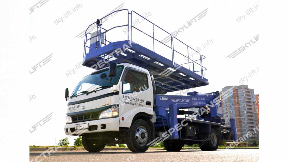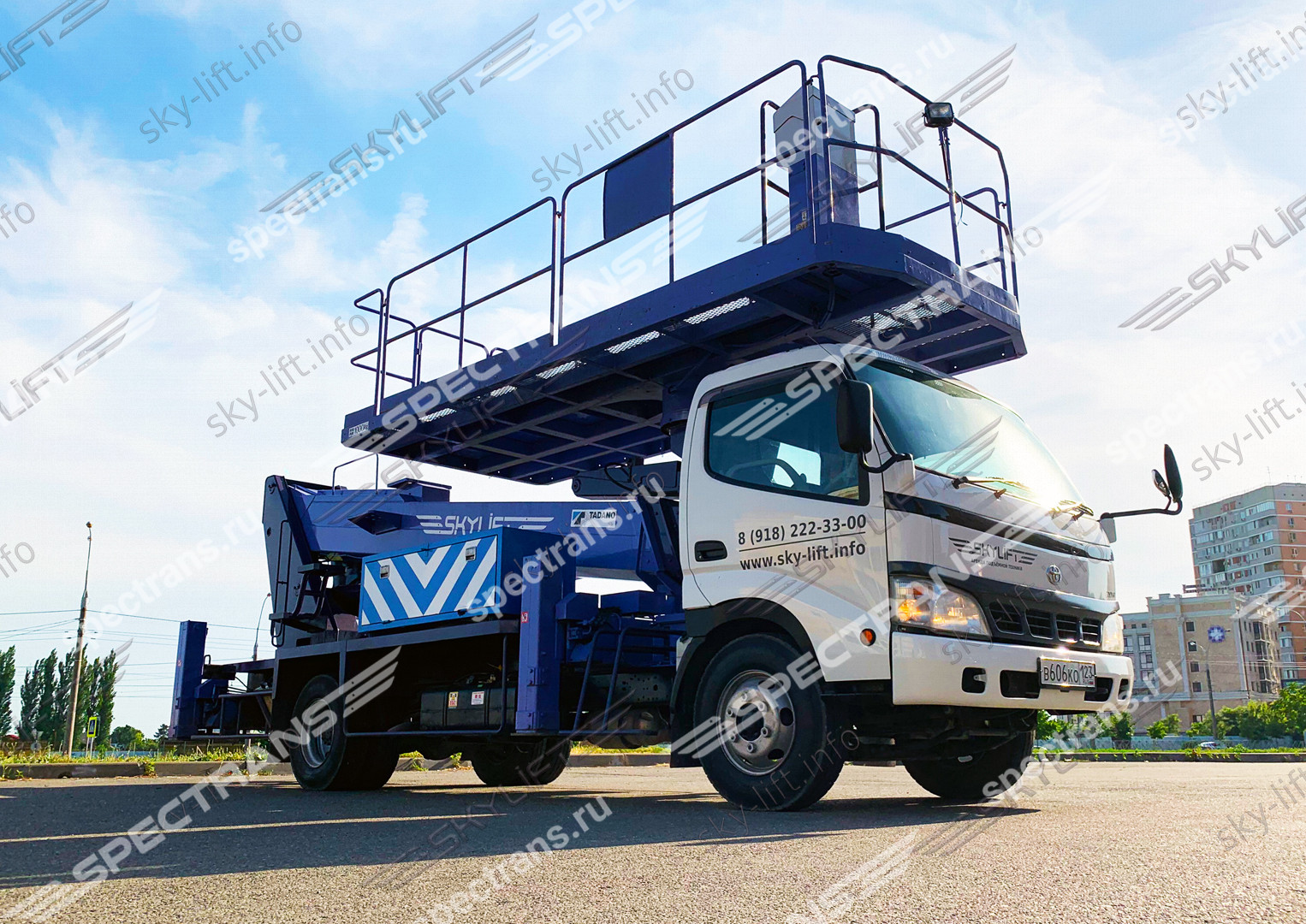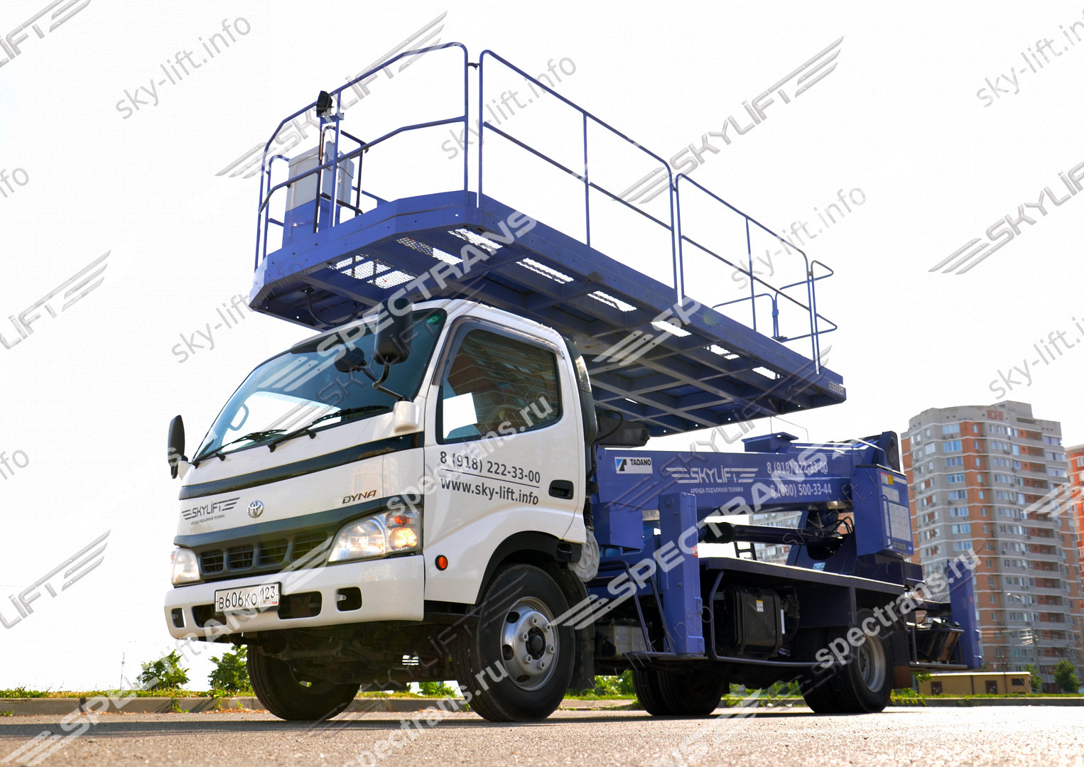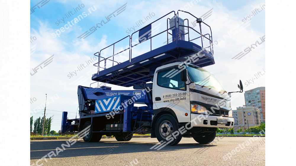 Автовышка позволяет выполнять работы на высоте до 22 метров. Эта установка - очень маневренный механизм, с грузоподъемностью корзины до 1000 кг. Преимущество подъёмника в том, что он имеет платформу (корзину, люльку) больших размеров 2 х 4 метра. Автовышка-платформа используется для поднятия тяжелых грузов на крыши зданий, для мойки и очистки фасадов и работ с линиями электропередач, для монтажа громоздких и тяжёлых рекламных конструкций (баннеры, растяжки, щиты) и установки промышленных сплит-систем.